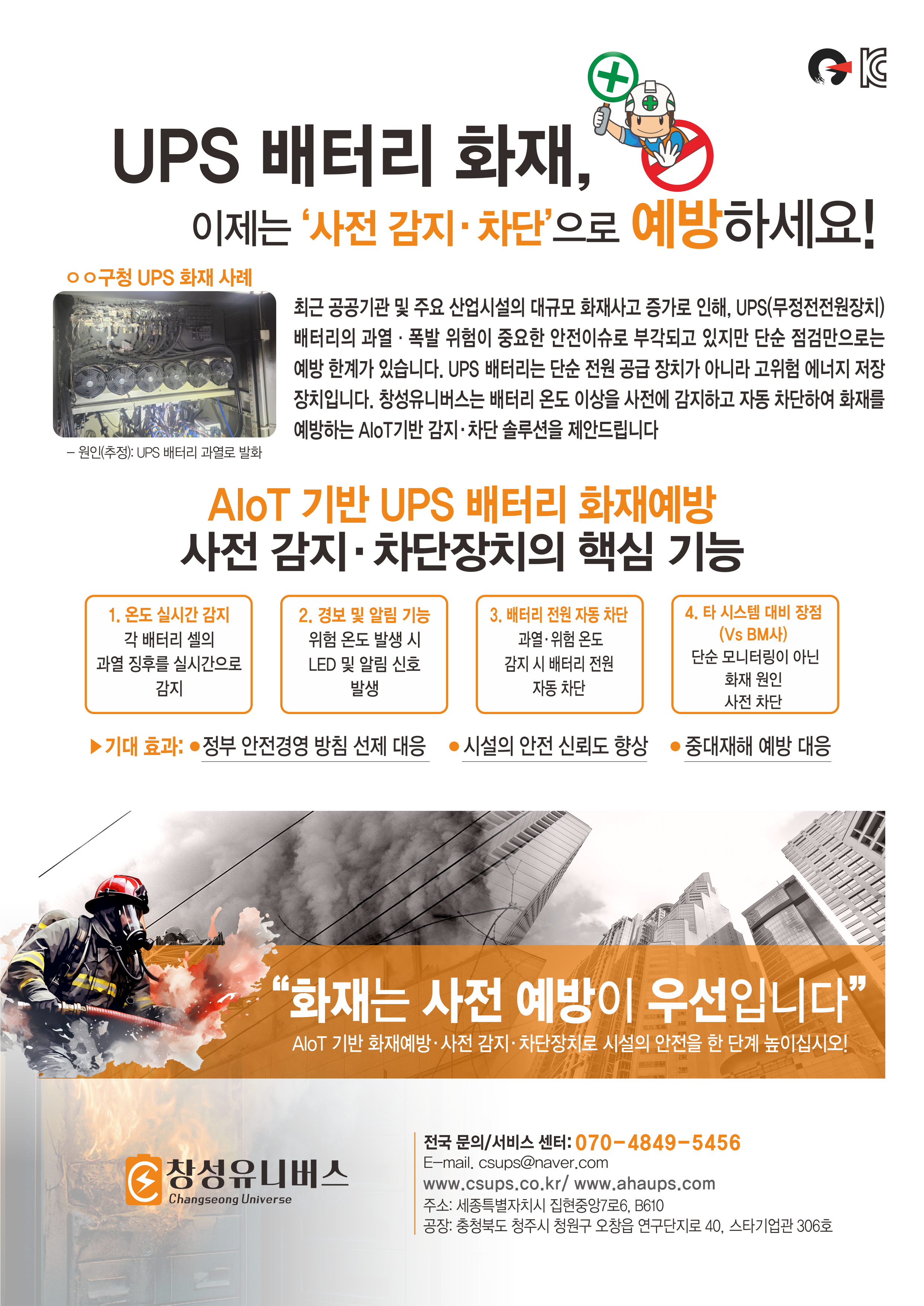 | 🔥 대전 국가정보자원관리원_배터리 화재 예방 최적 솔루션_AIoT 기반 UPS 창성유니버스 배터리 화재 예방 사전 감지 장치!!! (0) | 2025.10.24 |